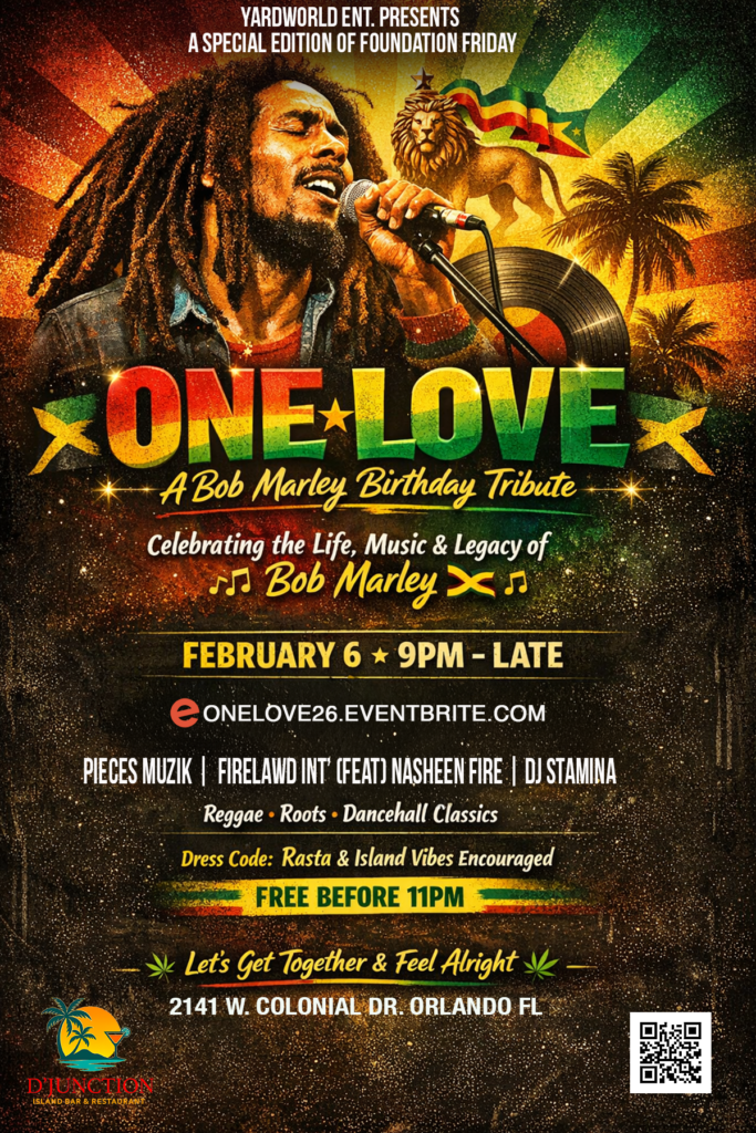 Join us as we celebrate the life, music, and legacy of Bob Marley with a night dedicated to roots reggae, foundation classics, and island culture. ONE LOVE brings together music, unity, and timeless vibes for a true reggae experience in the heart of Orlando.
